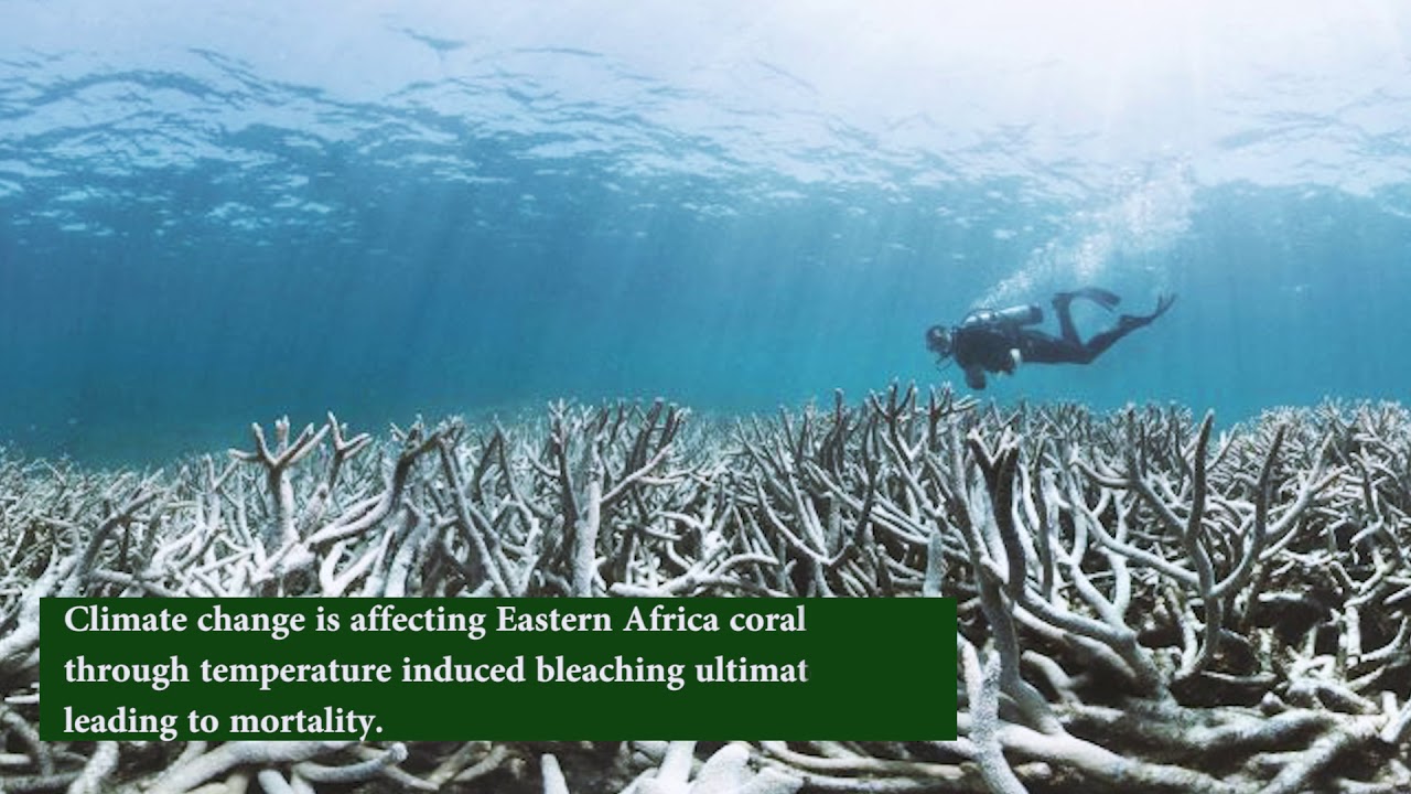 Climate change is affecting eastern Africa coral reefs through temperature-induced bleaching ultimately leading to mortality. Coral reefs which are mostly found in shallow oceans along the coastline, provide the perfect place for marine life to thrive. high temperatures due to climate change lead to coral bleaching. Bleaching is a process where corals lose their vivid color and turn white. This happens when zooxanthella algae which provide corals with food die due to ocean warming and acidification.