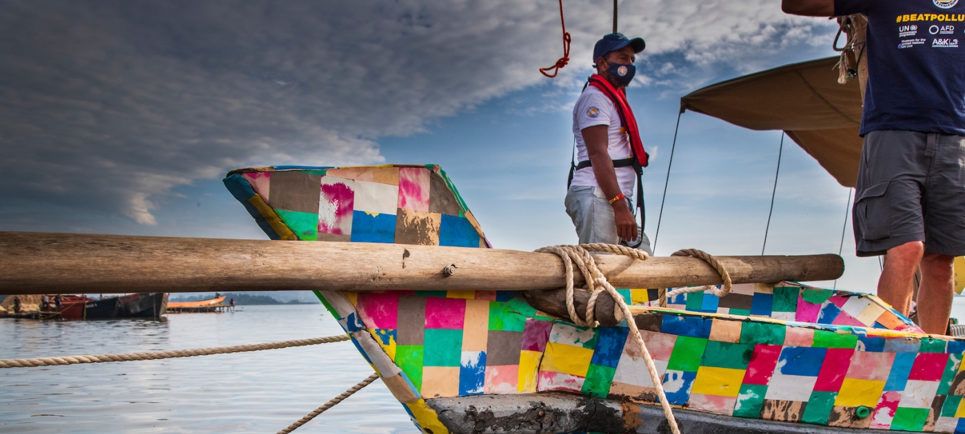 The Flipflopi was cobbled together from waste plastic, including flip flops, which make up much of its deck and hull. Photo: UNEP / Stephanie Foote